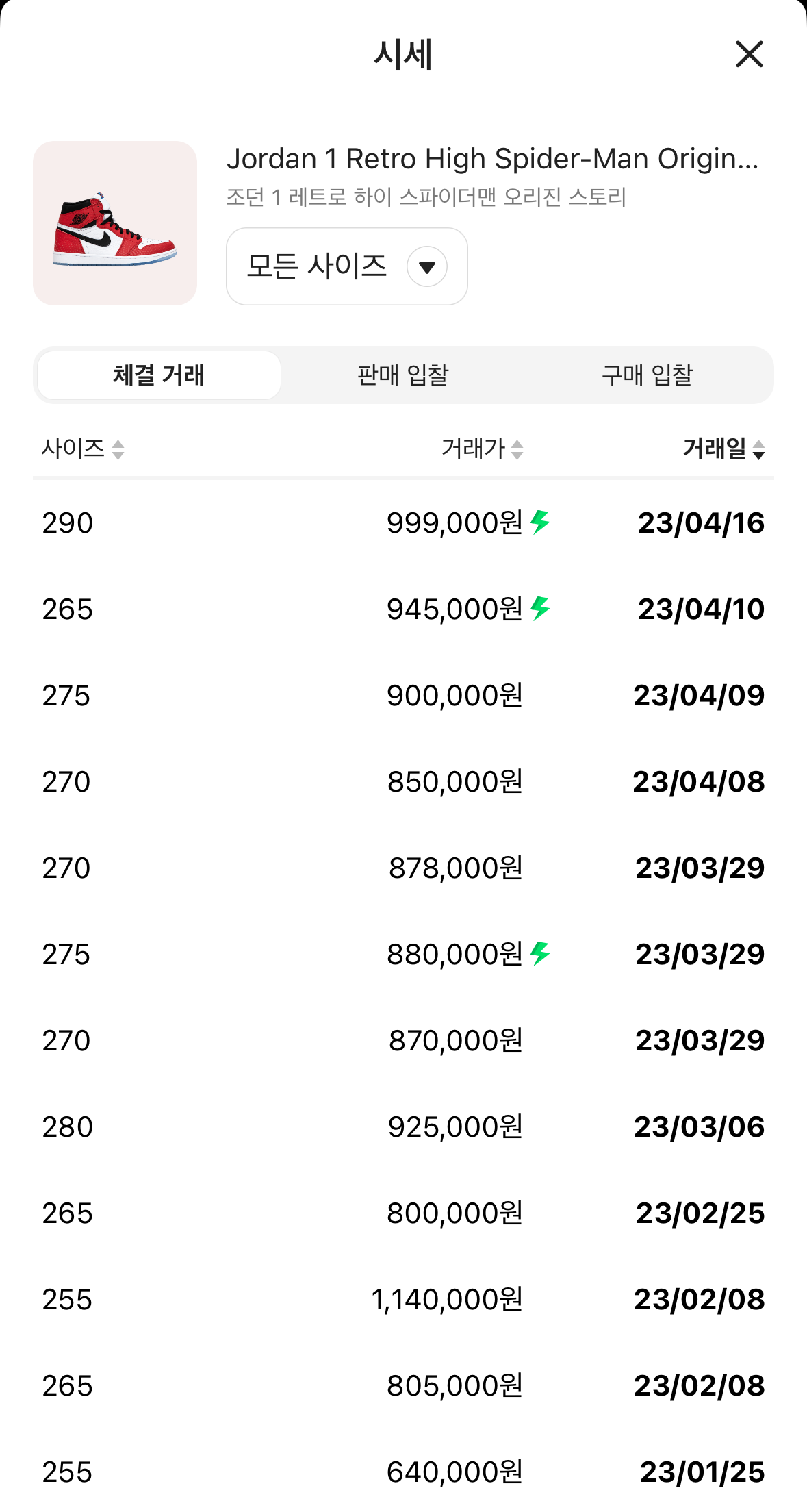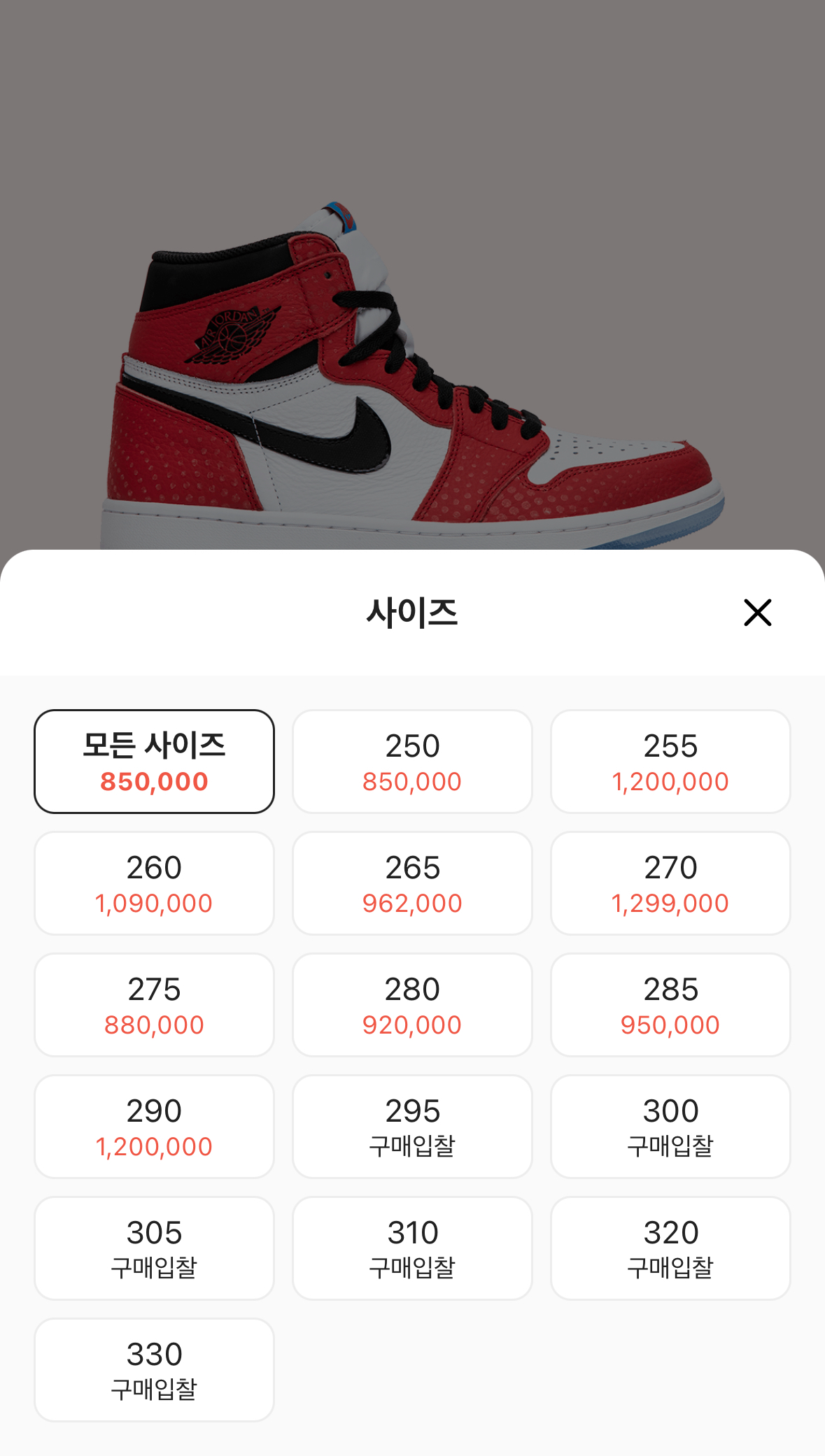 이전 스파이더맨 오리진 스토리 모델의 현재 리셀가격은 260mm 기준 90-100만원 정도에 형성 되어 있습니다.