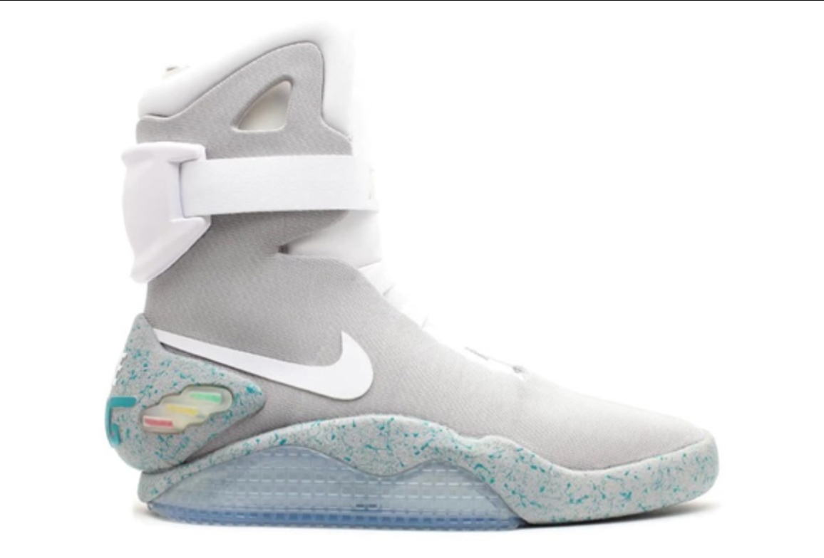 이 영화에서 가장 인상적인 신발로 알려진 나이키 『에어맥』은 영화 설정상 1985년을 살아가던 주인공이 2015년의 미래에서 일어나는 이야기들을 다루면서 미래의 신발에 대해 다양한 상상력을 통해 재미있게 해석하여 에어맥 이라는 신발을 탄생시켰고 이 영화를 그 당시 감상했던 많은 사람들은 아마도 언젠가 나이키가 저 신발을 출시할거라는 기대와 설렘을 가지게 했을 것 입니다. 영화의 설정 배경처럼 2015년을 예상 했으나 그보다 4년 이른 2011년에 1,500개 한정으로 초판을 출시하게 됩니다. 그리고 재미있는 것은 2015년에 재출시를 하게 되는데 초판에서는 영화에서 처럼 끈이 자동으로 조절되는 기능이 없어 아쉬움을 남겼다면 재출시된 모델은 지금의 나이키 어댑트 라는 기술로 신발끈을 자동으로 조절하는 기능을 탑재해 매니아들을 흥분시키는데 충분 했습니다. 아쉽게도 일반인 판매가 아닌 자선티켓 구매자에 한해 추첨을 통해 증정하였고 이후 글로벌 리셀 거래 플랫폼인 스탁엑스에서 2만 6천 유로 (한화 약 3,500만원) 에 거래되었습니다. 현재 STOCKX 에 제시된 판매 가격은 1.7억원으로 호가를 기록하고 있지만 최근 거래 금액은 9,900만원으로 약 1억원에 가까운 금액으로 체결 되었습니다. 국내에도 DJ KOO (구준엽님), 가수 장우혁님이 소장하고 있는 것으로 알려져 있습니다.