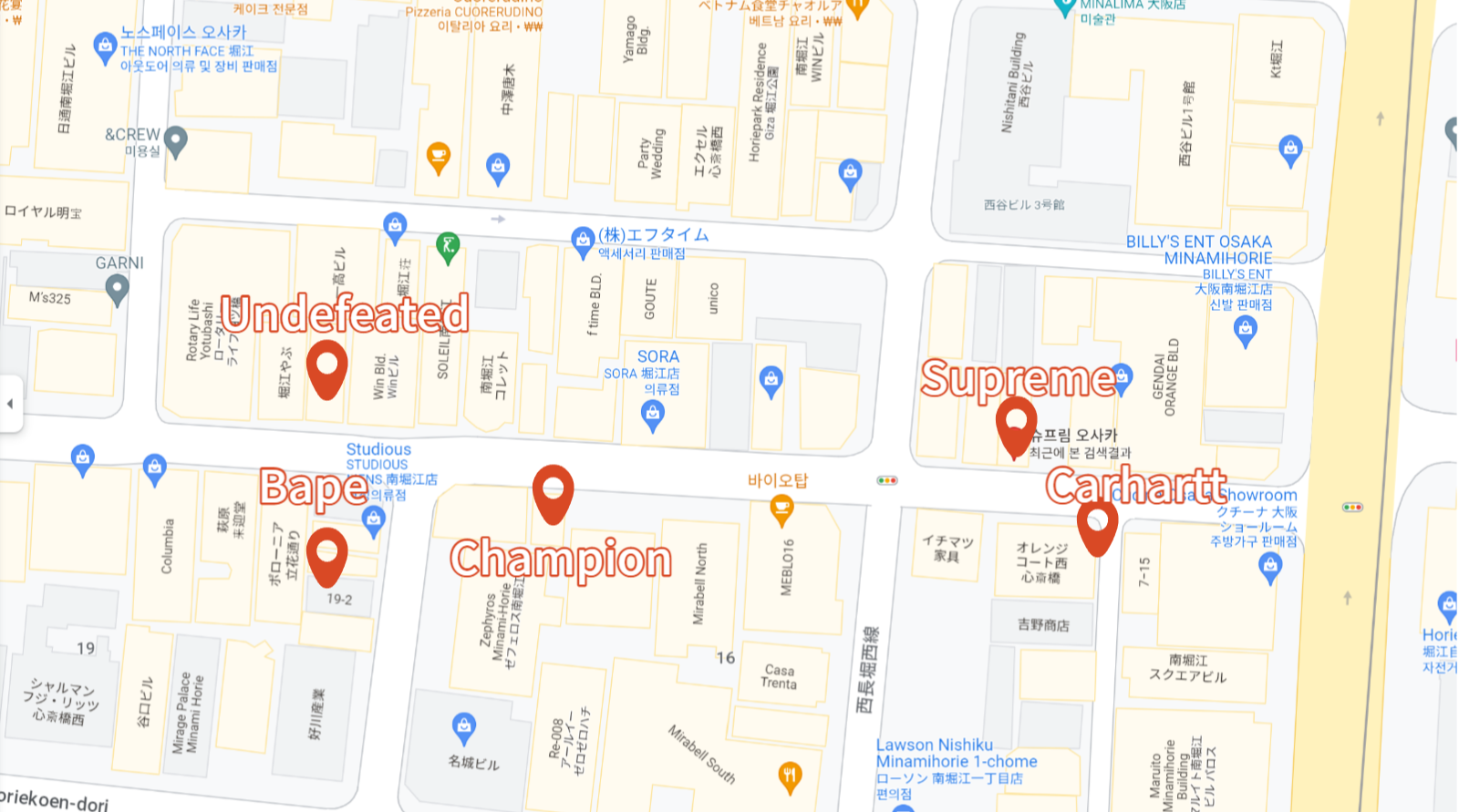 오렌지 스트리트 쇼핑 포인트 Carhartt 를 시작으로 슈프림과 베이프, 언디핏까지 골목 하나에 모두 모여 있어 이동거리를 최소화 하고 돌아볼 곳은 한번에 다 돌아볼 수 있는 장점이 있습니다.