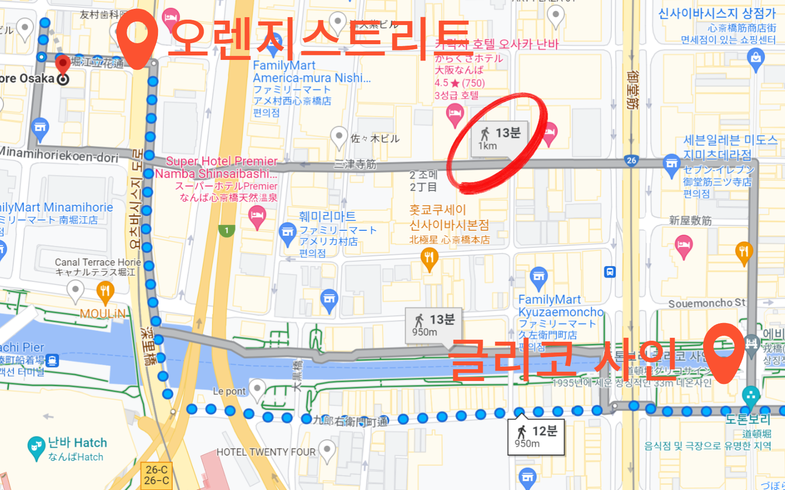 도톤보리 (글리코 사인) 에서 출발하는 기준으로 도보로 13분 정도 소요 됩니다. (아래 참고)