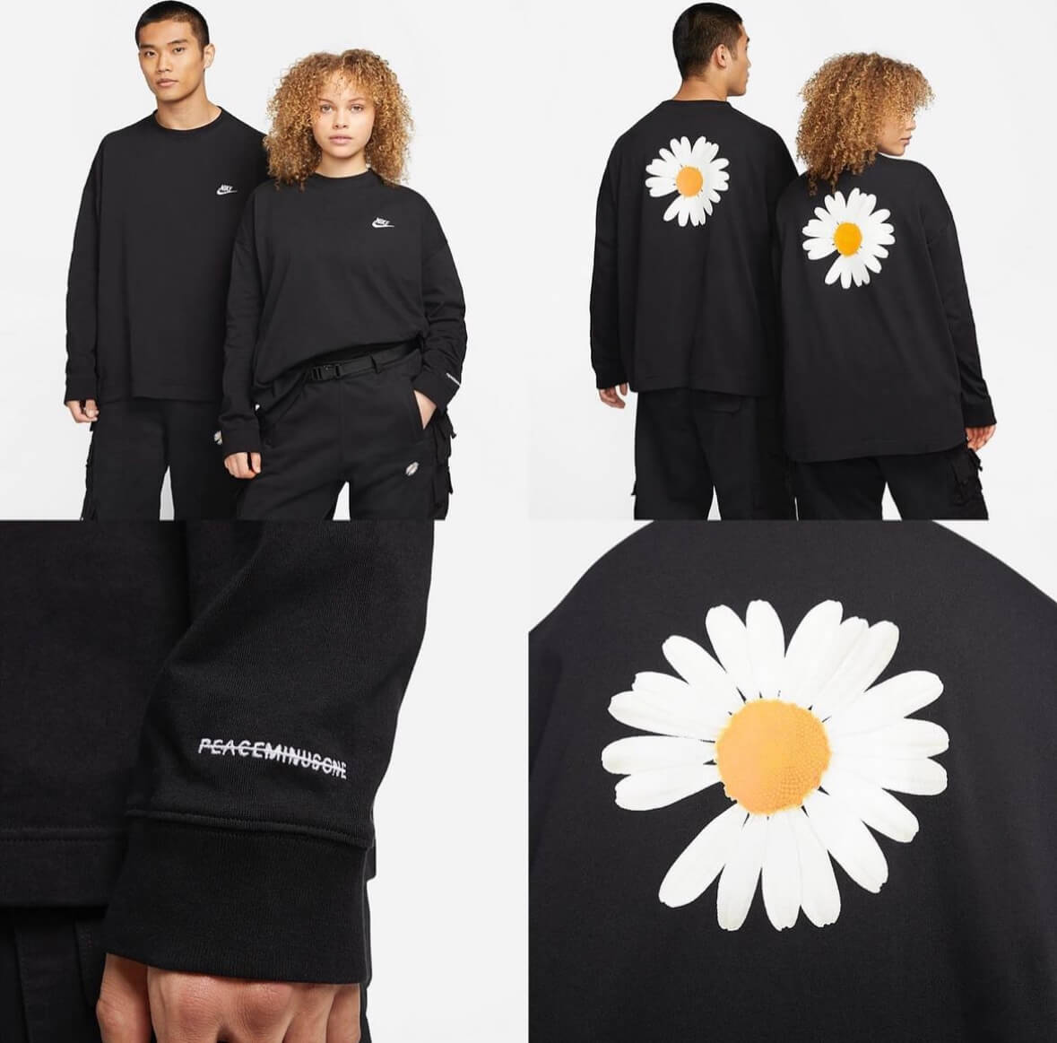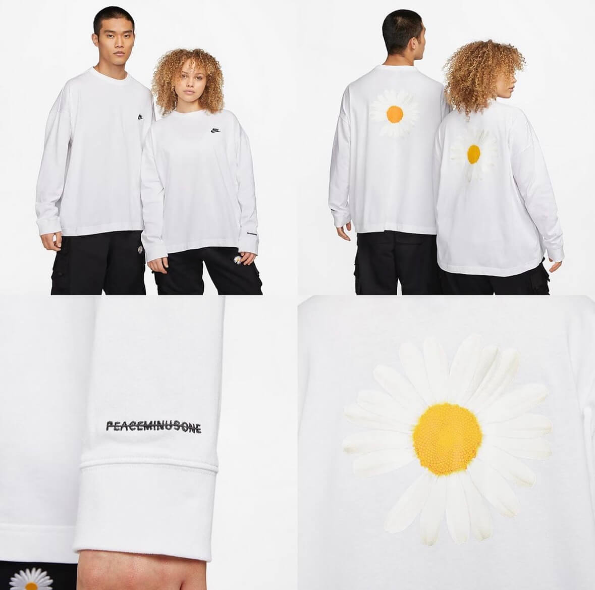 심플한 롱슬리브 티셔츠와 바지 그리고 블랙, 화이트 색상의 롱슬리브 티셔츠는 왼쪽 가슴에 나이키 로고, 뒷면에는 데이지, 소매부분의 피스마이너스원 레터링 로고를 넣어 깔끔하게 디자인 되었습니다.