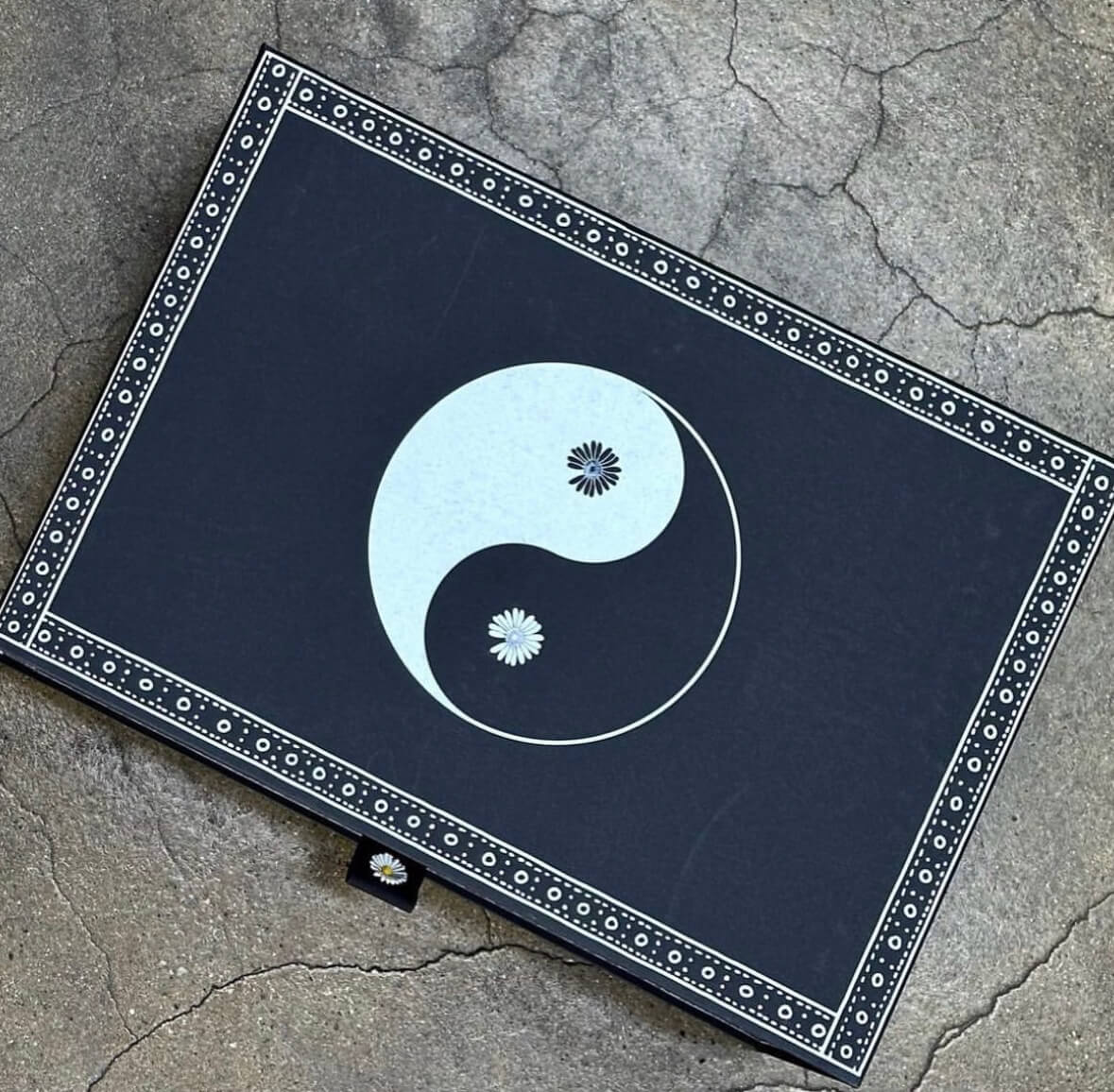 지난 첫번째 F&F 박스와 마찬가지로 박스 테두리에 박음질한 듯한 디자인 요소는 그대로 이지만 이번 블랙과 화이트가 조화롭게 이루어져있다는 이미지를 한번에 보여주는 태극 음양 로고가 프린팅 되어 있습니다.