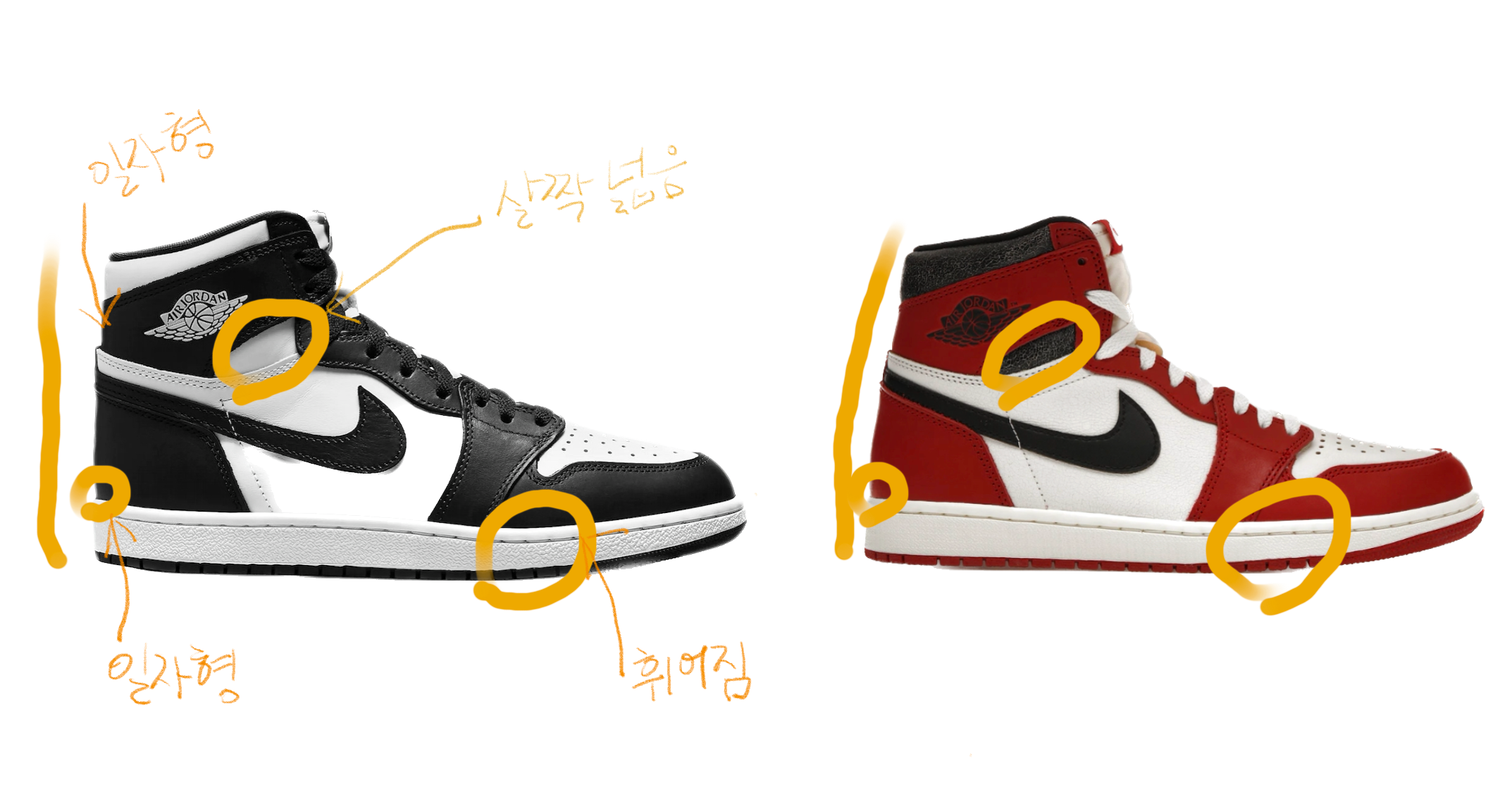 첫번째로 뒷축을 보면 '85 모델은 일자형으로 서있는 반면, 시카고는 약간 앞으로 기울고 미드솔과 뒷축이 맞닿는 부분이 약간 둥글게 되어 있는 것을 알 수 있습니다.