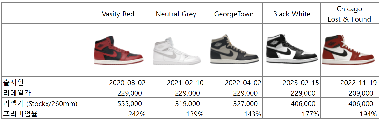 대장급 모델의 컬러웨이를 그대로 적용했지만 '85 모델로 출시 되어 리셀 측면에서는 당장은 그렇게 높은 가격을 형성하지 않을 것 같습니다. 2014년에 출시된 Retro OG 모델 범고래의 현재 리셀가는 1백만원이 약간 넘는 수준에서 형성되어 있습니다. 거기다 국내는 거의 극소량으로 발매되어 나이키 코리아 택이 붙어 있는 신품은 구하기 어렵습니다.