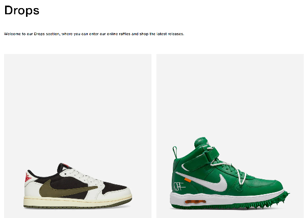 Drop 사이트로 연결되면 아래와 같이 응모가 가능한 신발들의 사진이 나옵니다.