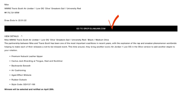 트래비스 스캇과 같이 인기 있는 신발들은 국내 응모만으로는 부족하다보니 직배가 되는 해외 사이트를 찾게 되는데 SLAM JAM 에서 응모하는 방법을 다시 한번 요약해드리니 참고하시기 바랍니다.
