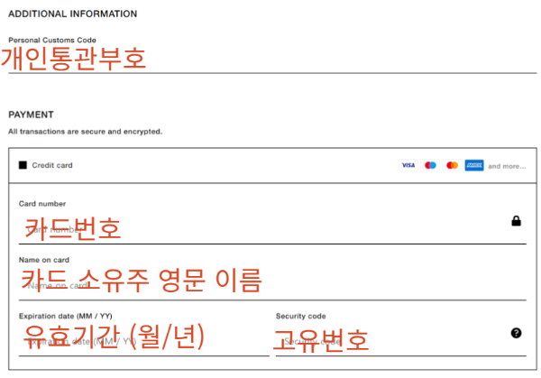 개인통관부호를 입력하고 PAYMENT 의 빈칸에 카드 번호를 포함한 신용카드 정보를 입력하여 줍니다.