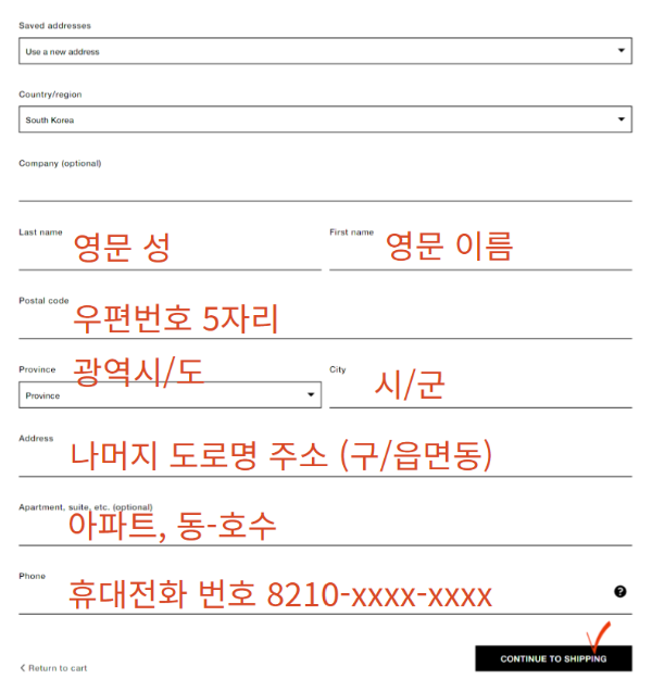 배송 받으실 한국 주소를 영문으로 채워주시고 CONTINUE TO SHIPPING 버튼을 눌러 완료 합니다.